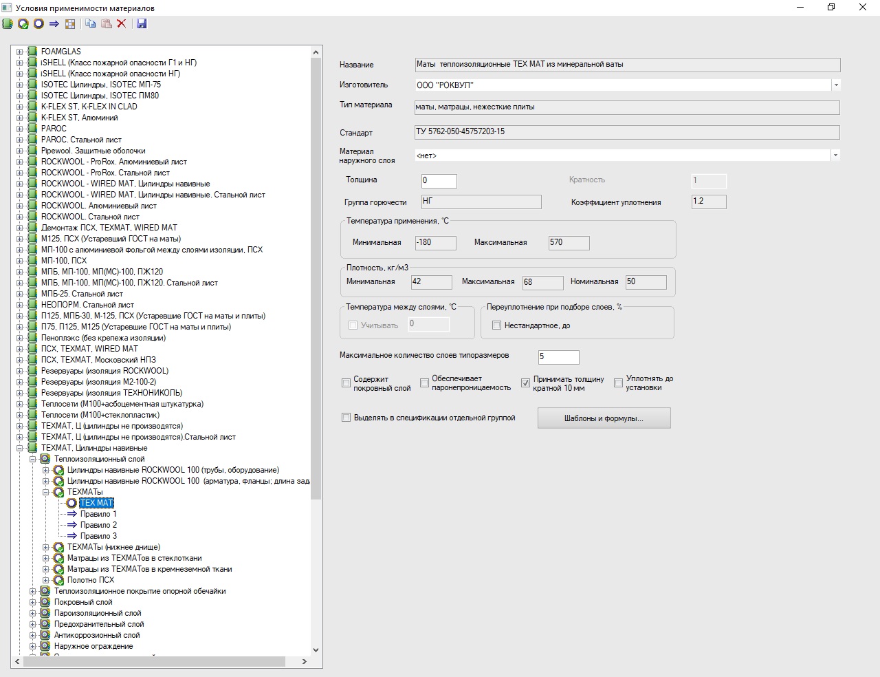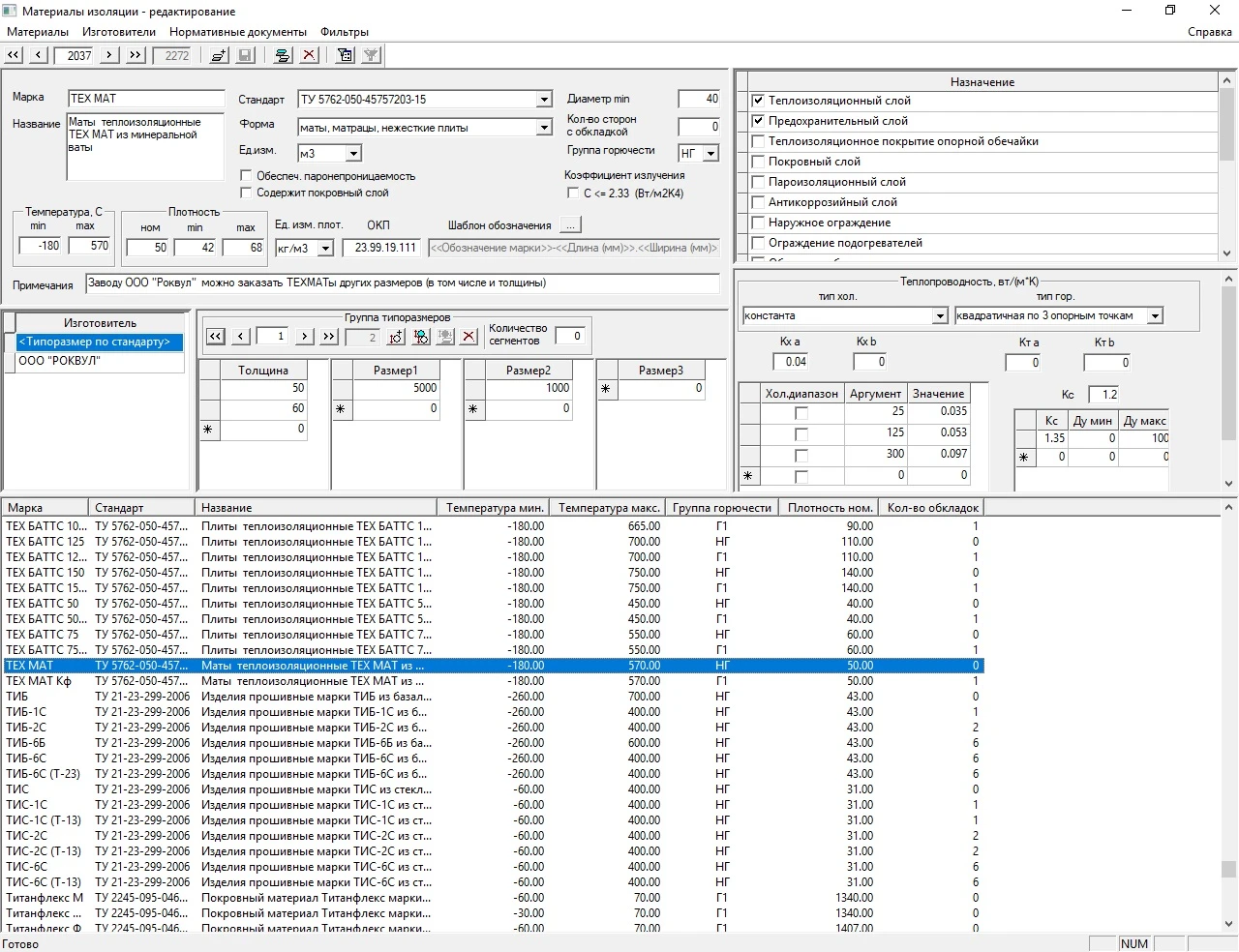 Программа имеет собственную базу данных изоляционных материалов. Эта база данных открытая и гибкая по своей структуре – она позволяет просматривать данные по материалам и редактировать их с помощью удобного редактора базы данных